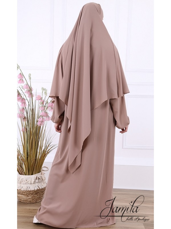 Notre khimar égyptien, de couleur taupe, élaboré dans les ateliers de confection de la marque Jamila, est une cape 2-en-1. Cela assure une meilleure couverture par rapport au jilbab classique. La cape ne prend pas le corps dans son ensemble, contrairement au jilbab 1 pièce. Le fait que cette cape n'enveloppe pas le corps dans sa totalité procure à celle qui le transporte un meilleur confort.